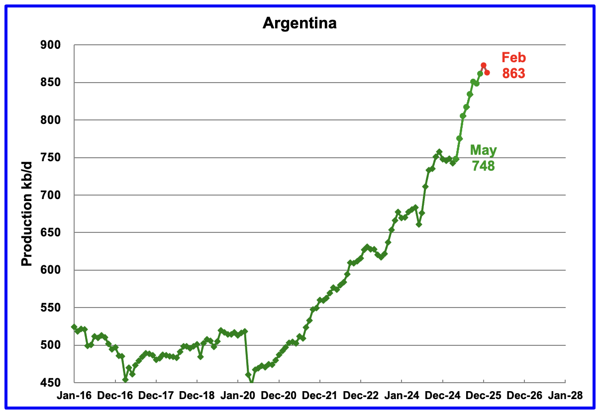 Argentina’s production has grown by 115 kb/d since May. Red markers are production as reported by the Argentina Ministry of Energy.