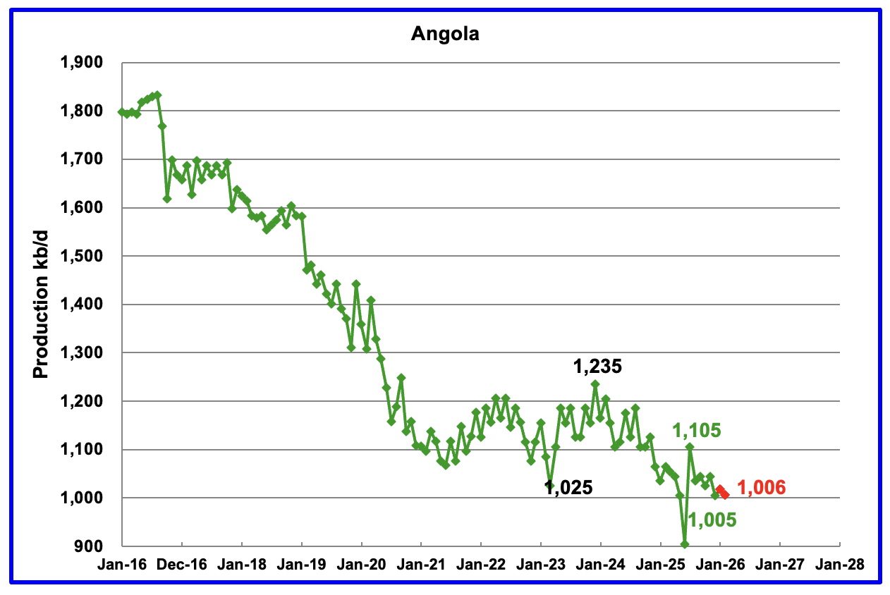 The EIA reported Angola’s December oil production dropped by 40 kb/d to 1,005 kb/d.