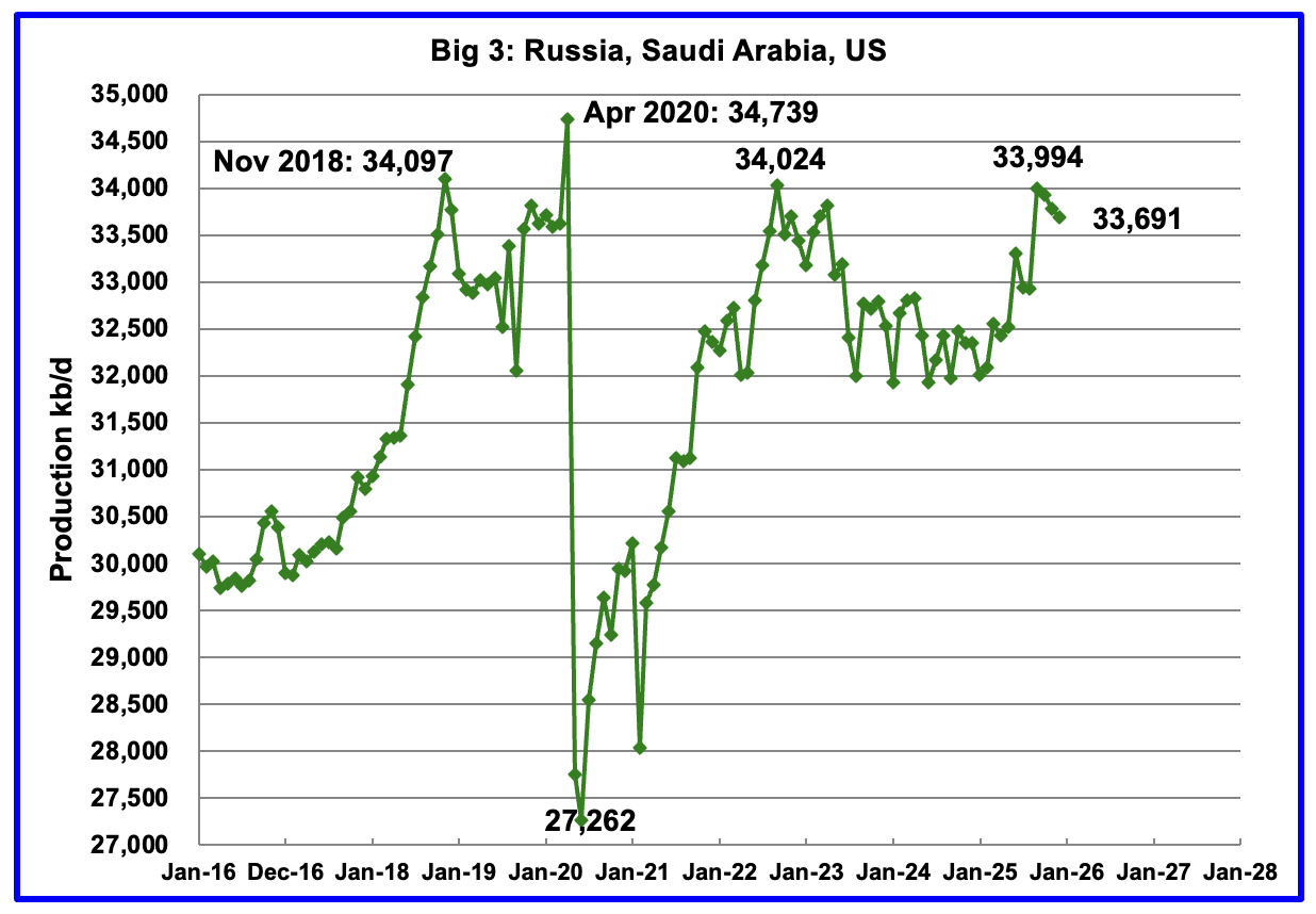 December’s Big 3 oil production decreased by 93 kb/d to 33,691 kb/d. The US December drop was offset by the Saudi Arabia increase.