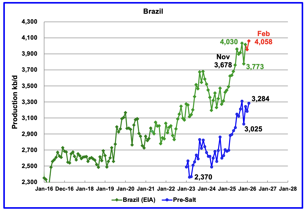 The EIA reported that Brazil’s December production rose by 242 kb/d to 4,015 kb/d. According to this Article, the pre-salt reservoirs remained the backbone of national production, accounting for nearly 80 per cent of total oil and gas output.