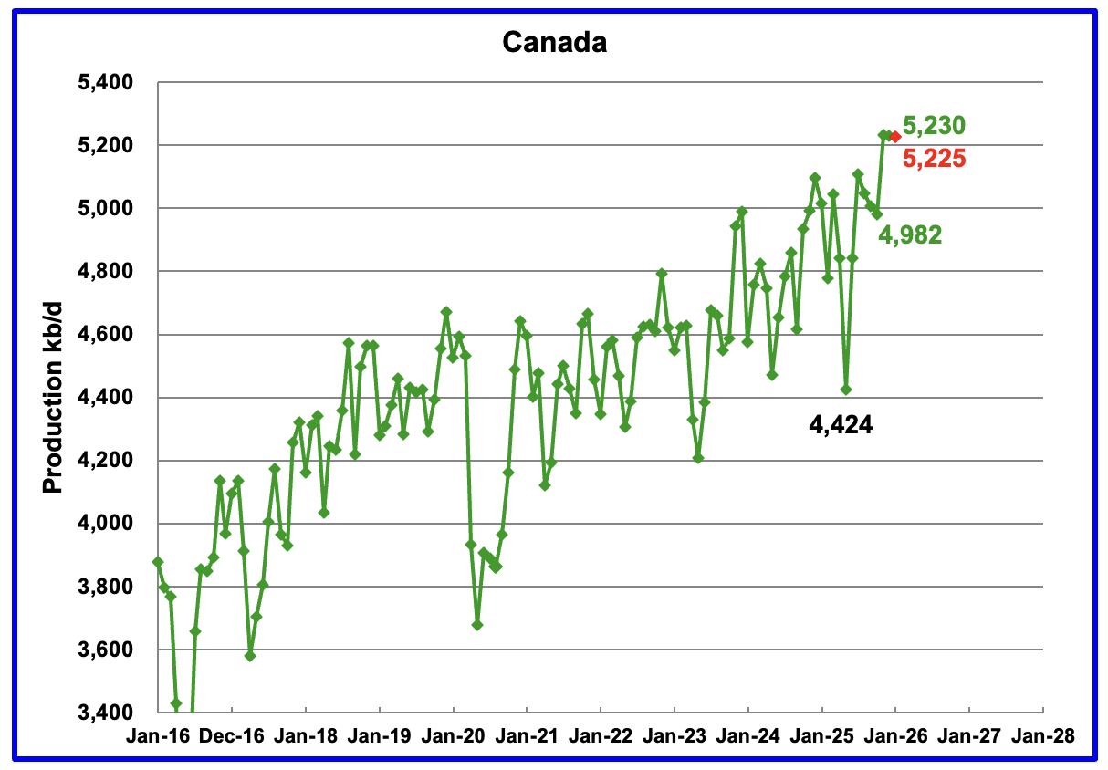 Canada’s oil production decreased by 4 kb/d in December to 5,230 kb/d.