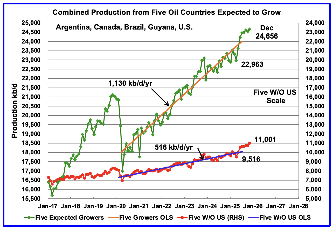 To show the impact of US growth over the past 5 years, U.S. production was removed from the five countries and that graph is shown in red. The production growth slope for the remaining four countries has been reduced by 614 kb/d/yr to 516 kb/d/yr.