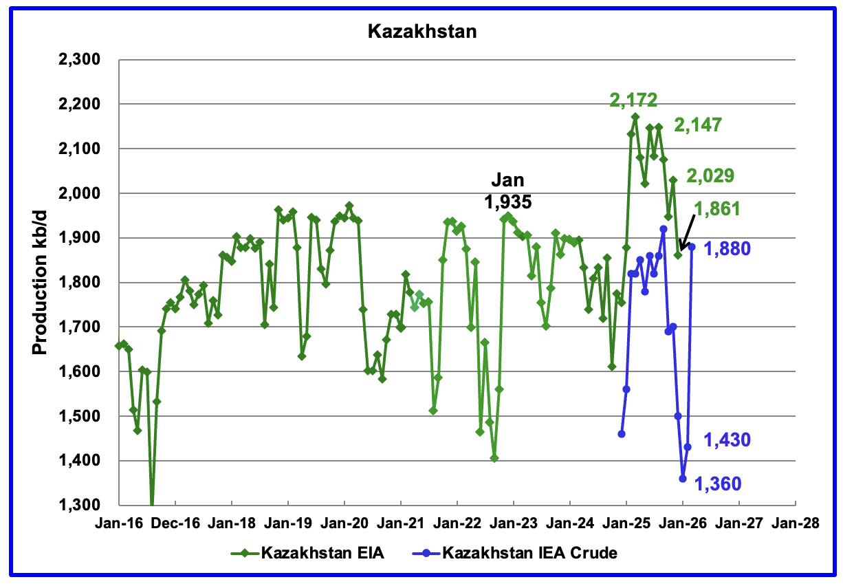 Since Argus no longer reports OPEC + crude production, production data for Kazakhstan will now be taken from the monthly IEA reports. The IEA’s March OMR reported January 2026 production was 1,360 kb/d. The April OMR reported that production rebounded in February and March. March production rebounded by 450 kb/d to 1,880 kb/d even though this Report stated that Kazakhstan was supposed to reduce production in March.