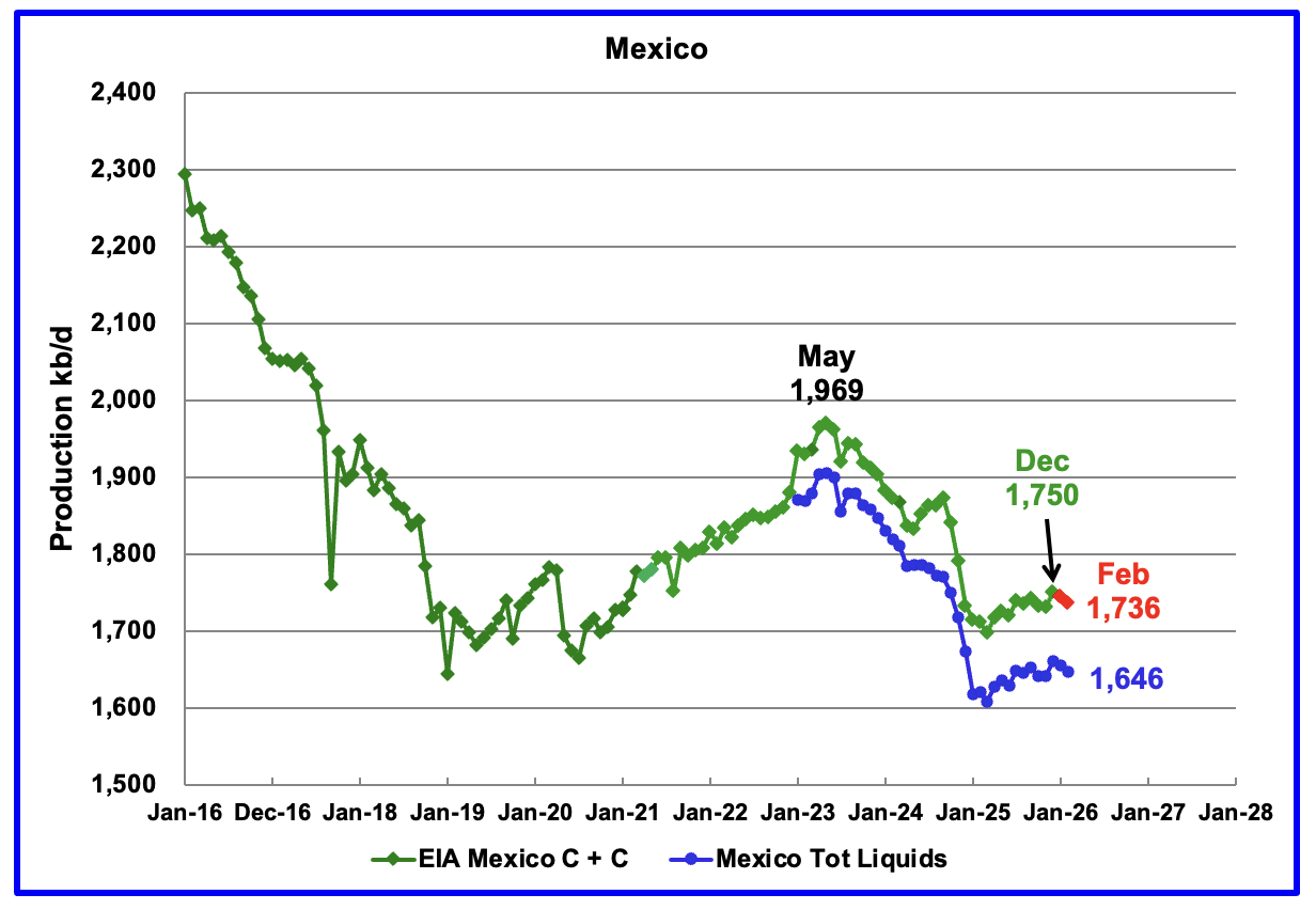 In earlier EIA reports, they would add close to 55 kb/d of condensate to the Pemex’s “Total Liquids” report. More recently the EIA has been adding 90 kb/d of condensate to Mexican production. For January and February production, 90 kb/d have been added to the Pemex report. February’s production is estimated to be close to 1,736 kb/d. Note that Mexico’s production, as reported by Pemex for the last eight months has stabilized around 1,650 kb/d.