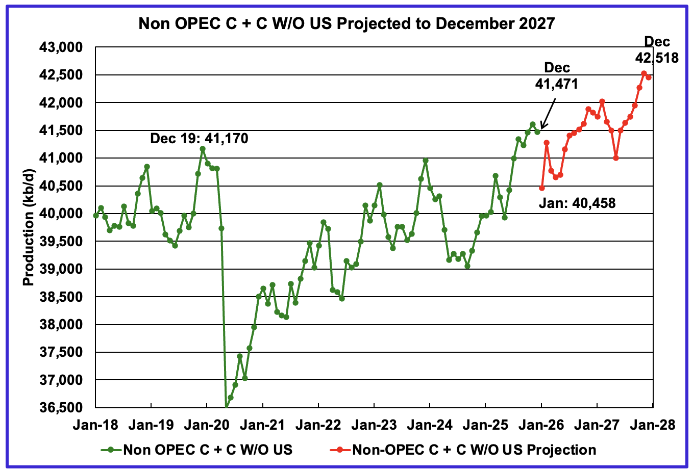 From December 2025 to December 2027, production in Non-OPEC countries W/O the U.S. is expected to increase by 1,047 kb/d to 42,518 kb/d.