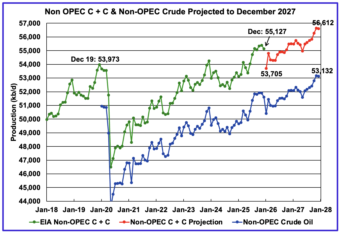 Using data from the April 2026 STEO, a projection for Non-OPEC oil output was made for the period January 2025 to December 2027. (Red graph). Output is expected to grow by 1,489 kb/d from December 2025 to reach 56,612 kb/d in December 2027.