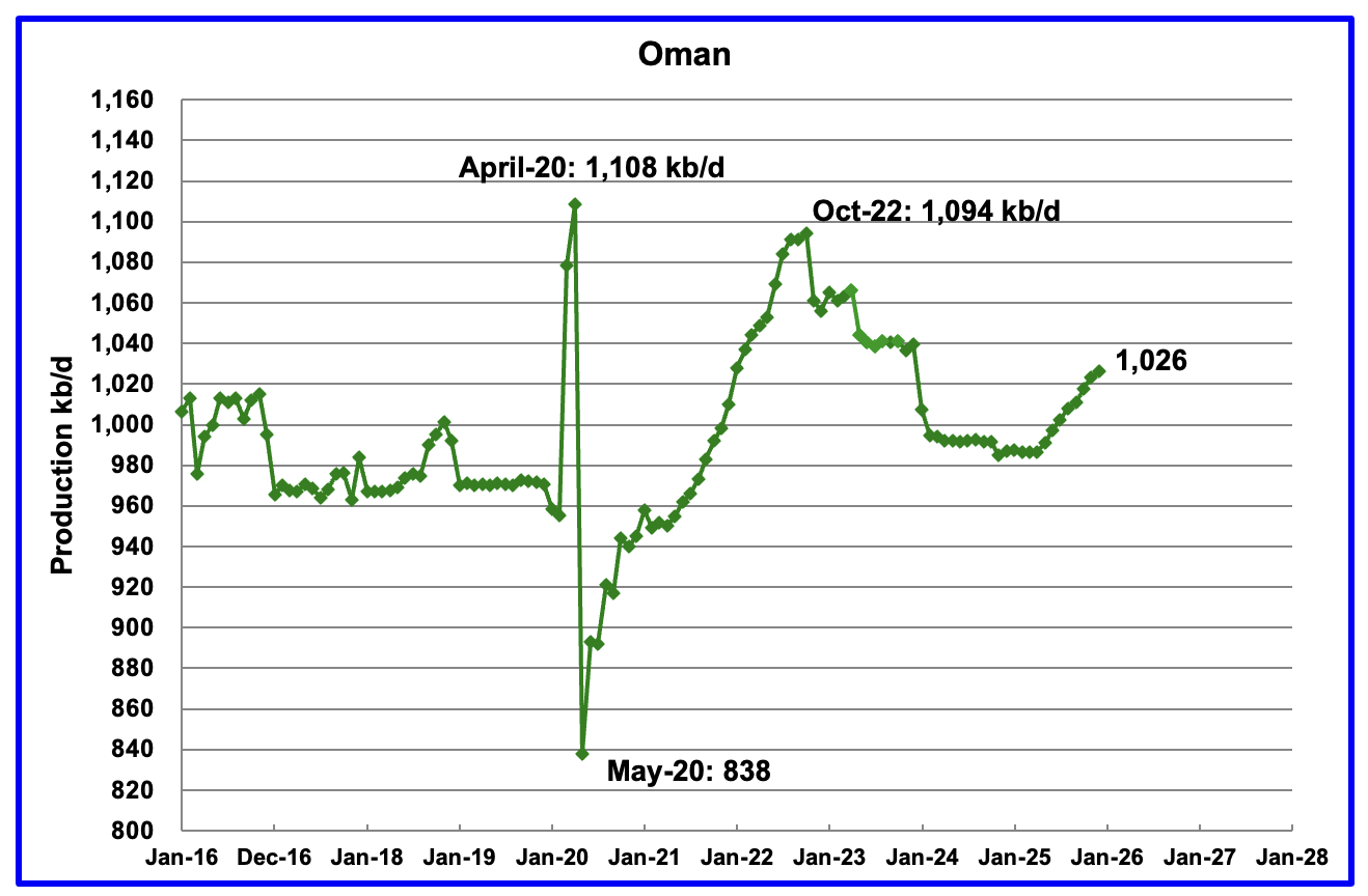 According to the EIA, December’s output rose by 3 kb/d to 1,026 kb/d. Oman’s production appears to have started a budding growth phase. Previous production peaked in October 2022.