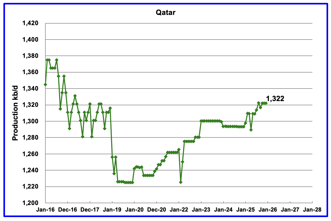 Qatar provided the EIA with monthly updated oil production back to January 2025 but seems to have stopped again in August. Qatar’s December output was reported to be 1,322 kb/d, unchanged from November.