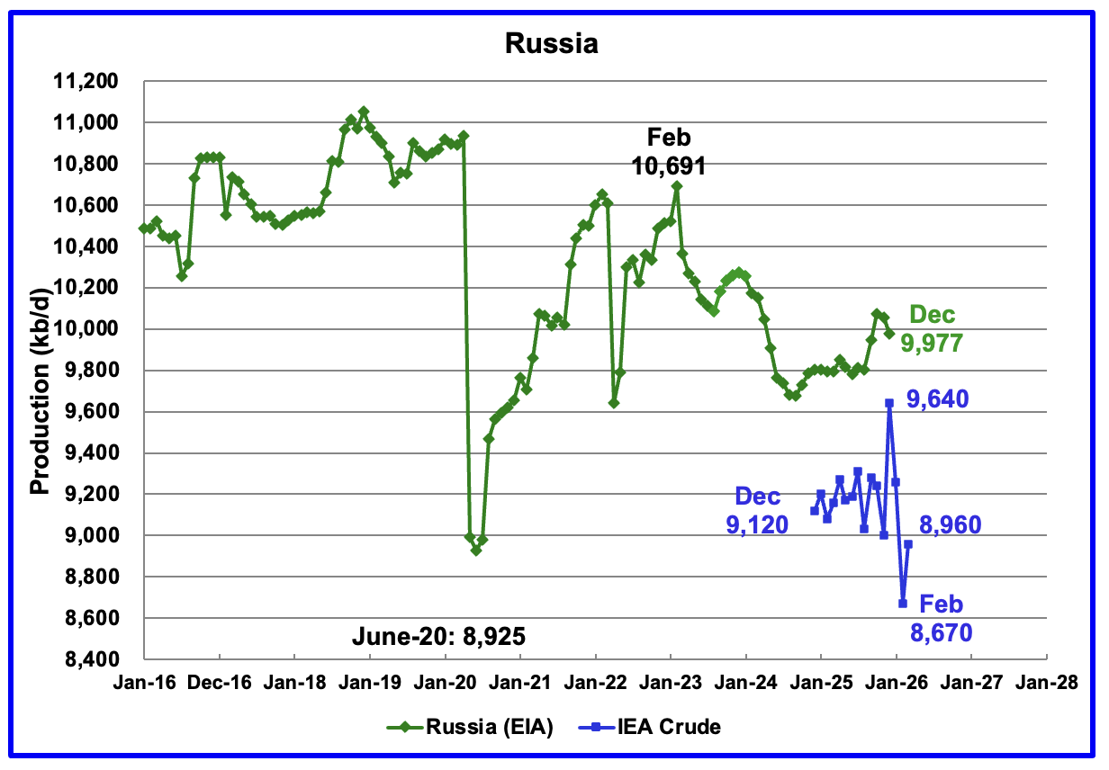 The EIA reported Russia’s December C + C production decreased by 80 kb/d to 9,977 kb/d and was up by 172 kb/d from December 2024.