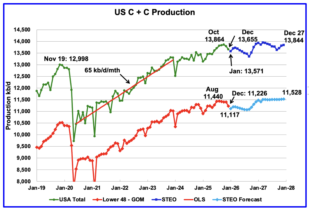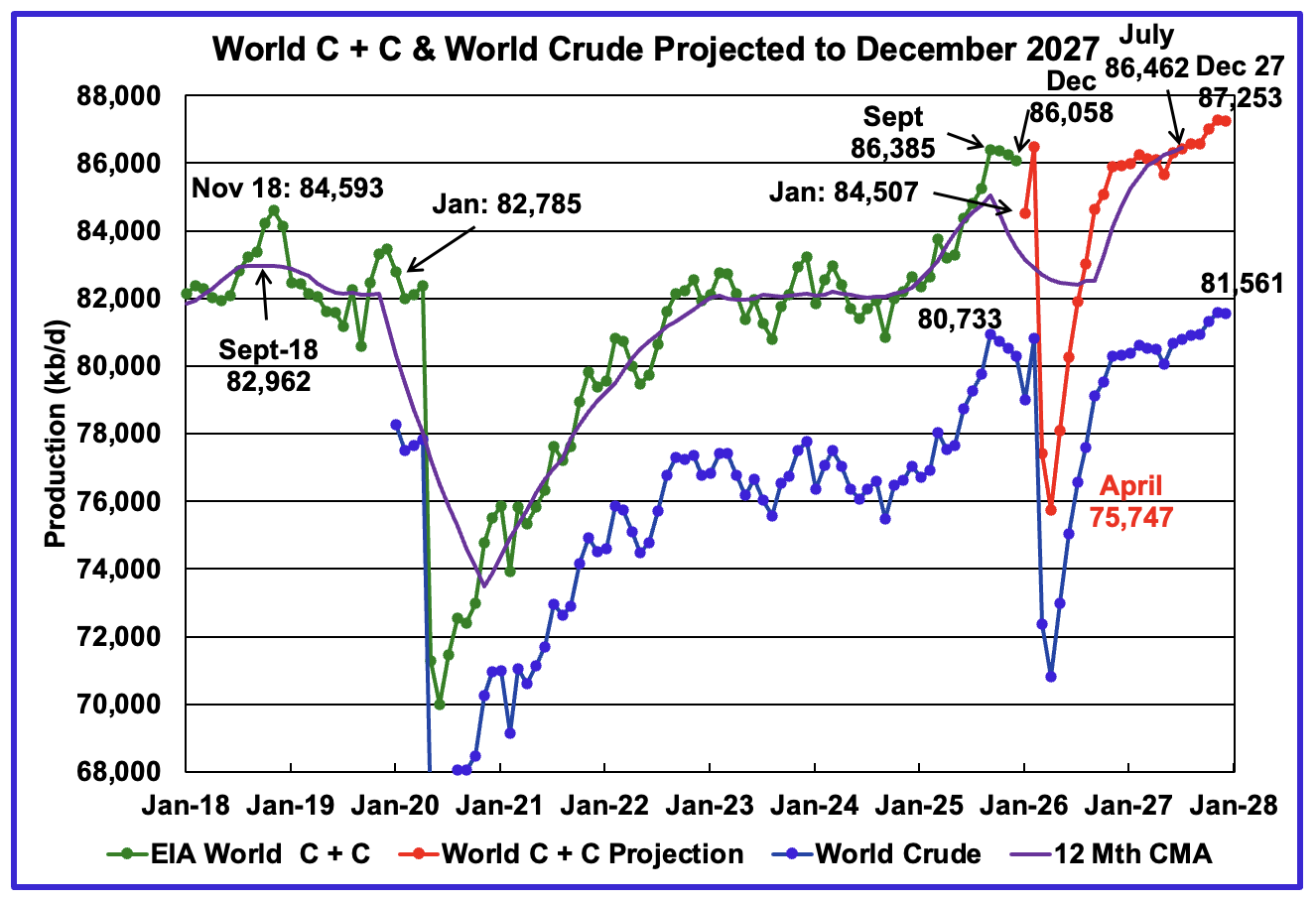 This chart has been updated using the April 2026 STEO to project World C + C production out to December 2027. It uses the STEO report along with the International Energy Statistics to make the projection. Production in January 2026 is projected to decrease by 1,551 kb/d to 84,507 kb/d. March/April production drops by more than 10,000 kb/d due to the Iran/US war. April production at 75,747 is 10,722 lb/d lower than March 2026.
