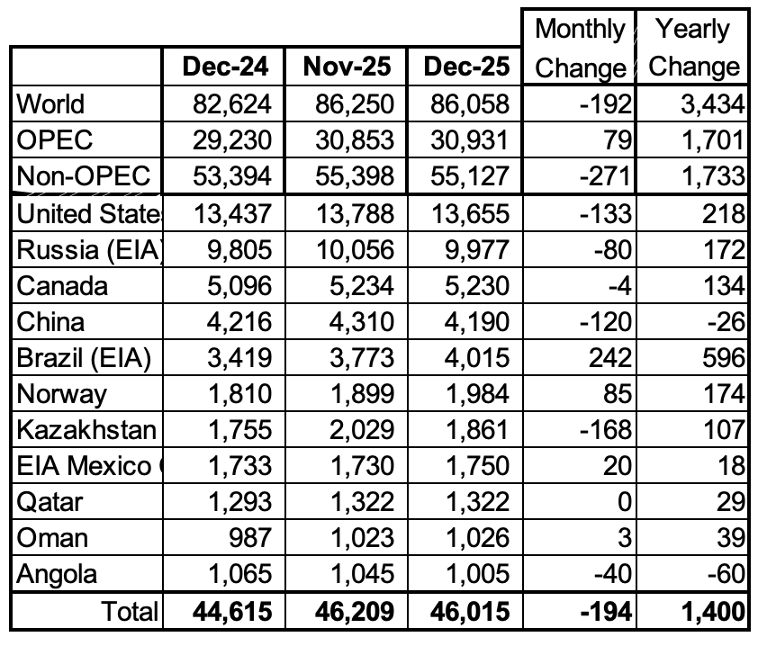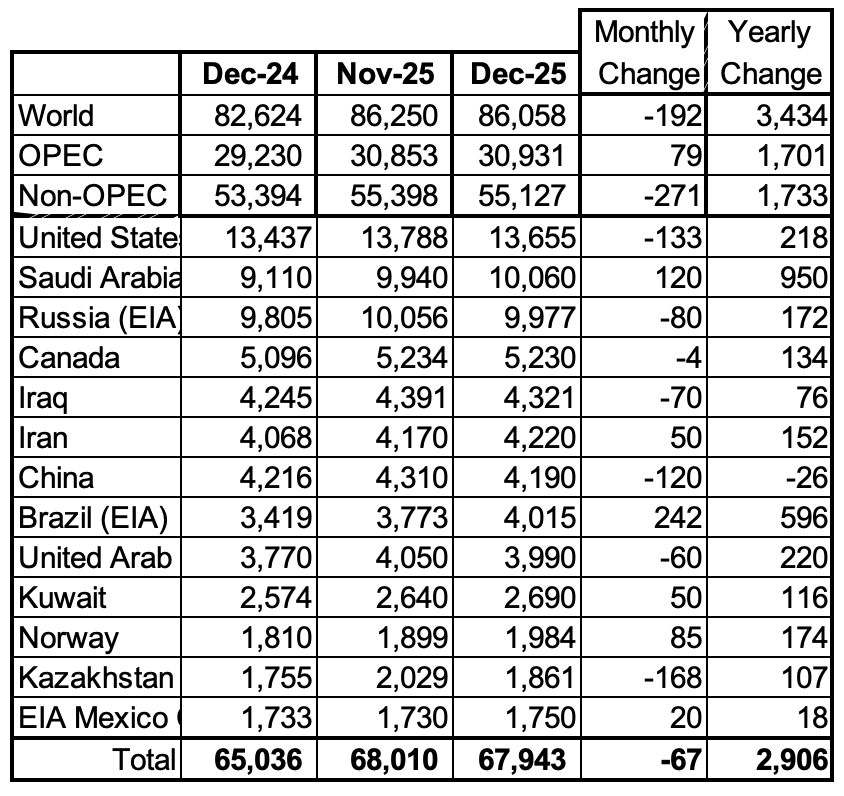 The World’s December oil production decreased by 192 kb/d to 86,058 kb/d.