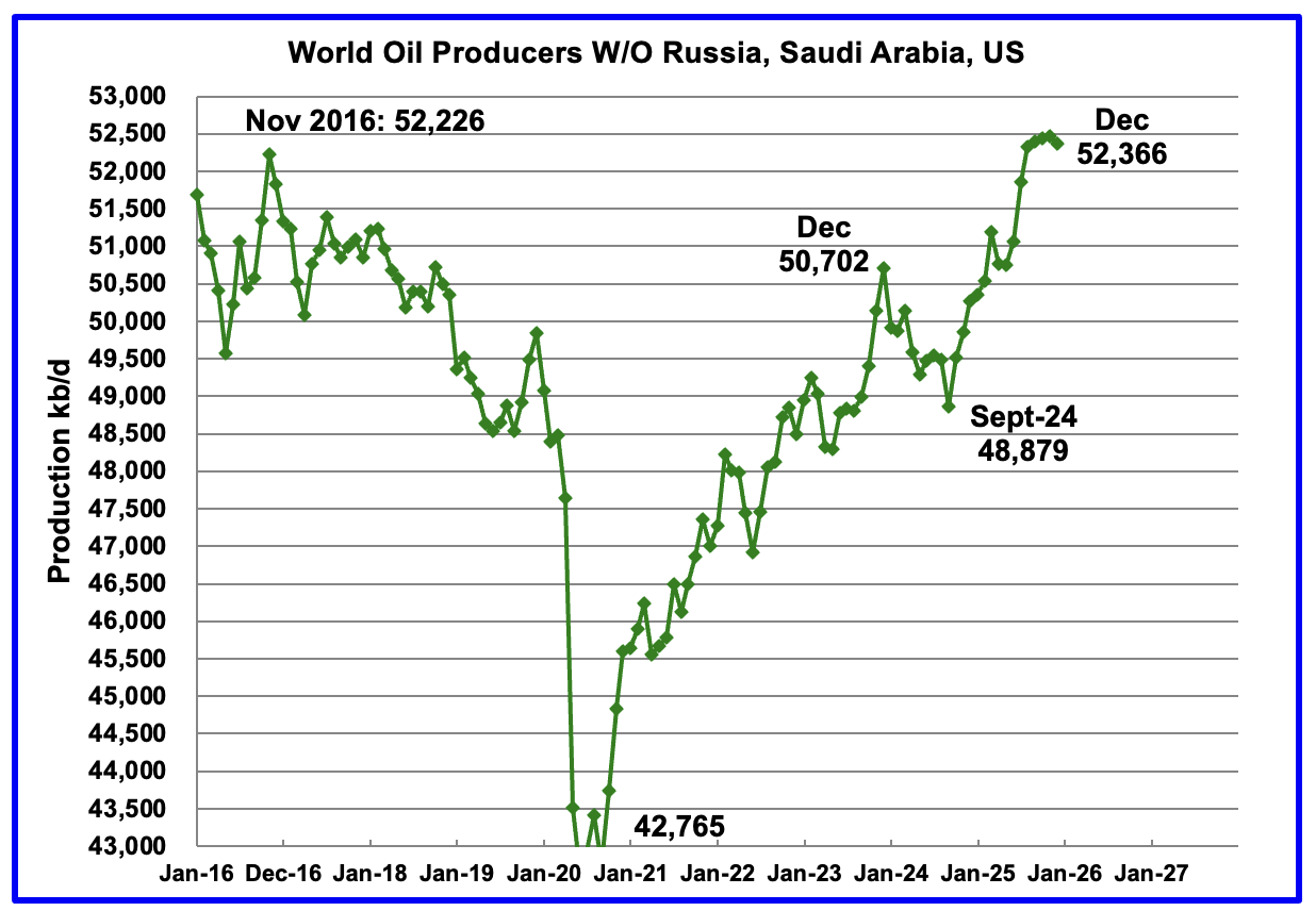 Production in the remaining countries has been slowly increasing since the September 2020 low of 42,765 kb/d but dropped in December. December 2025 production dropped by 100 kb/d to 52,366 kb/d. Gains in Brazil were offset by losses in Kazakhstan, China and Iraq,