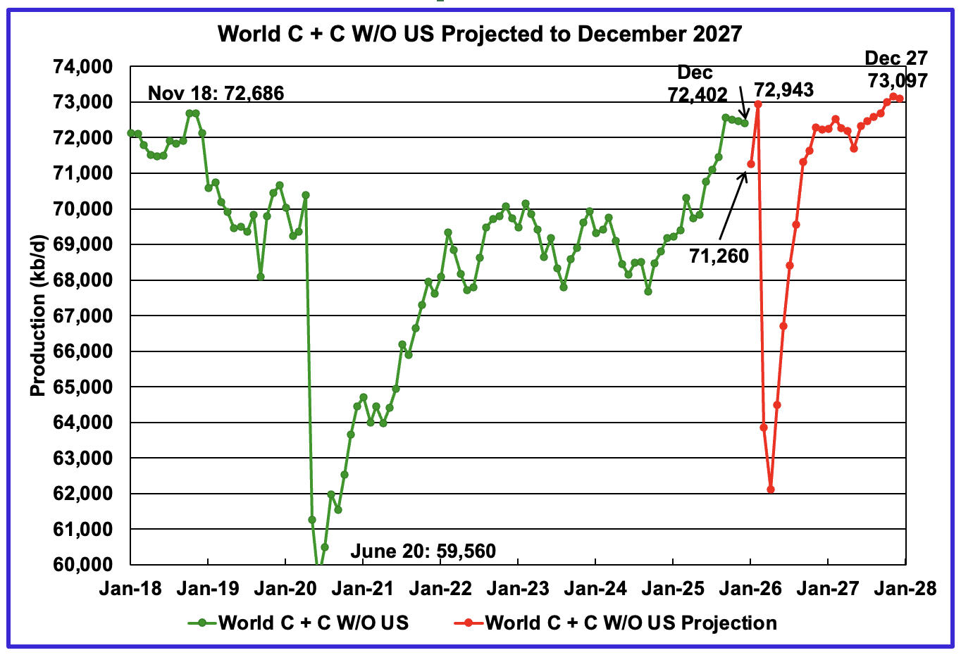 The projection is forecasting that December 2027 World W/O US oil production will be 73,097 kb/d. This is only 154 kb/d higher than the expected February production of 72,943 kb/d. Very little growth expected from the Non-US World oil producing countries.