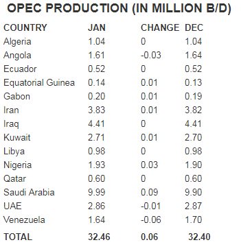 Platts – OPEC’s crude production averaged 32.46 million b/d in January, a rise of 60,000 b/d from December, as gains by Saudi Arabia and Nigeria more than offset Venezuela’s continued slide in output, an S&P Global Platts survey showed Wednesday.