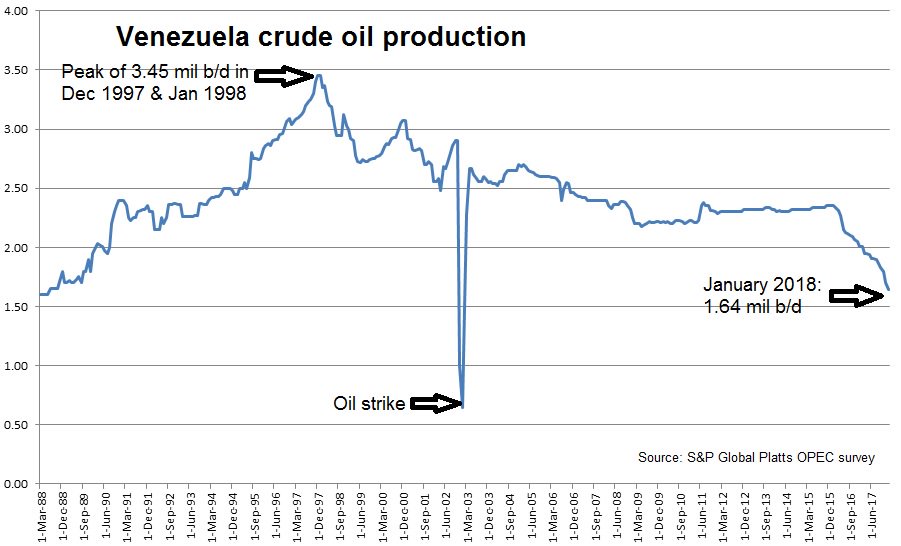 Ok, I’ll try mine, and see how much closer I come to actual. Demand up 1.7 million bpd, US increases .7 million bpd, and Venezuela drops .3 million bpd. Which leaves us drawing more than 1 million per day for 2018. That leaves oil prices at ?.