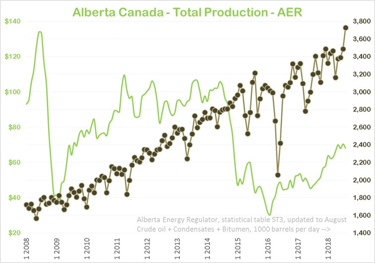 Daily Brent spot prices from July 2017 to Oct 2018, linear trend has been an annual rate of increase of about $24/b over that period. If the 21 month trend continues (and this is of course unknown) we would reach $100/b by next August or so, (the trend line is at about $81/b at the end of Sept 2017, so might reach $105/b if the trend continues for another 12 months. I expect the trend will end at about $90 to $100/b as pipeline capacity increases in the fall of 2019 in the Permian basin, prices may remain at around $100/b until Iranian, Nigerian, Venezuelan, and/or Libyan issues are resolved or deepwater projects get developed, whichever occurs first. Probably that doesn’t happen (no increase in output from OPEC or deep water to save the day) and oil prices pause at $100/b before rising further to $150/b by 2024 or 2025.