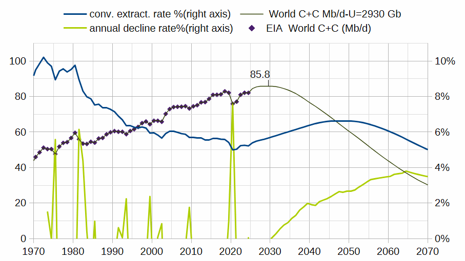 Here is a shock model I did for World C+C in November 2025, my best guess at that point in time. Future extraction rates and discoveries are not known, so this is likely (or certain) to be incorrect. The scenario has a plateau in World C+C output between 85.1 and 85.8 Mb/d from 2026 to 2032.