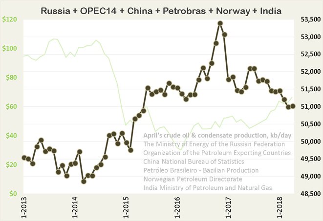 The data here is from the Russian Minister of Energy and is through April 2018. It is crude+condensate. Production in April was almost flat, down 5,000 bpd. Data from the Russian Minister of Energy averages about 400,000 barrels per day above what the EIA reports for Russia.