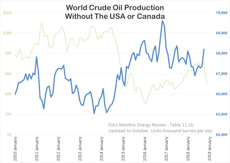 The charts at the end are really good for analysis. I see if US production is flat, or close to it, for 2019, then World could be flat to down for that period. That could still put 2019 over 2018, depending on how long the OPEC cuts last. I really don’t expect it to remain that way, its just the way it looks at this point, in time. However, it is likely to remain that way for a longer period of time than I first imagined, as the Permian pipelines are likely to be on hold longer than first expected. I see little substantial increase in the Permian during 2019. While Dennis and EIA expect a 500k bpd increase from shale in 2019, I don’t. Even if it does, plugging that in, makes the world, essentially, still flat. Which is horrible for supply, when you consider decline rates, and any increase in demand.