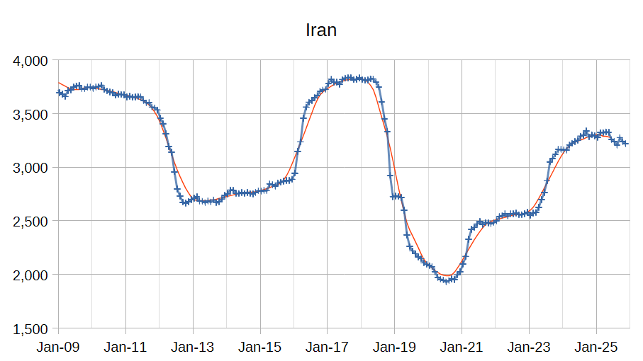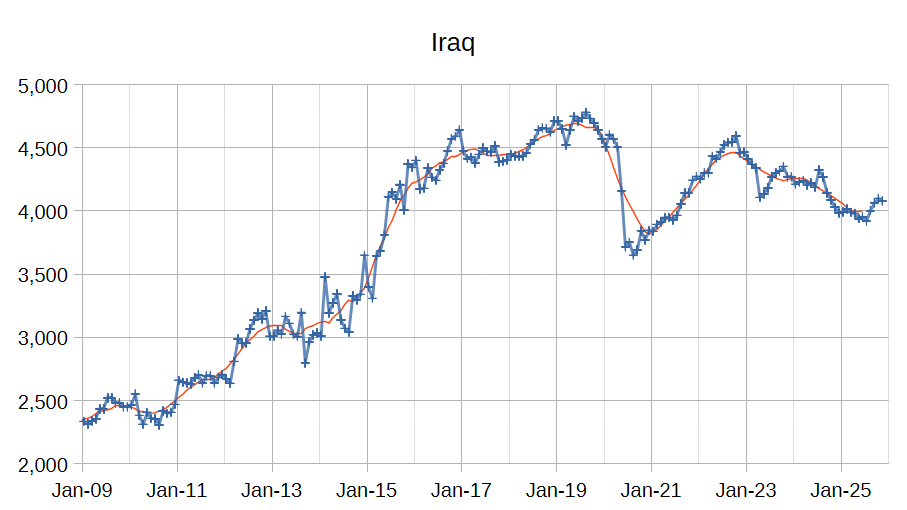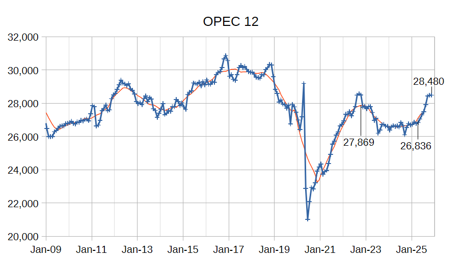 The OPEC Monthly Oil Market Report (MOMR) for December 2025 was published recently. The last month reported in most of the OPEC charts that follow is November 2025 and output reported for OPEC nations is crude oil output in thousands of barrels per day (kb/d). In the OPEC charts below the blue line with markers is monthly output and the thin red line is the centered twelve month average (CTMA) output.
