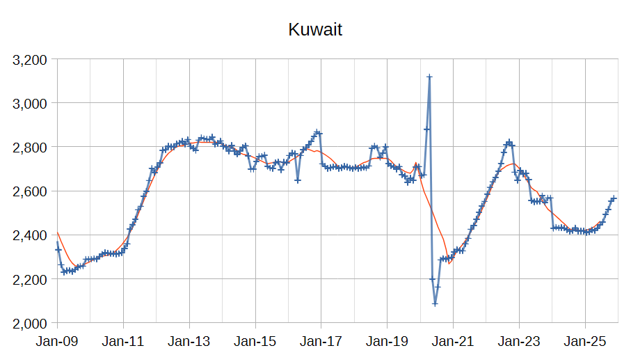 The chart above shows output from the Big 4 OPEC producers that are subject to output quotas and where most of OPEC spare capacity currently exists (Saudi Arabia, UAE, Iraq, and Kuwait.) After the pandemic, Big 4 average output peaked in 2022 at a centered 12 month average (CTMA) of 20849 kb/d, crude output has been cut by 766 kb/d relative to the 2022 CTMA peak to 20073 kb/d in November 2025. The Big 4 may have about 766 kb/d of spare capacity when World demand calls for an increase in output. Since April 2025 the OPEC Big 4 have increased output from 18346 kb/d to 20073 kb/d, an increase of 1727 kb/d in just 7 months (an average monthly increase of 247 kb/d.) The rate of increase in Big 4 output seems to be reaching a plateau. Note that some spare capacity remains if increased output is needed and also that UAE has surpassed the 2022 CTMA peak by some 250 kb/d, if this recent level of output can be maintained for 12 months or more then the spare capacity of OPEC would be 250 kb/d higher than the 766 kb/d indicated on the chart above, we will have to see what happens over the next 12 months.