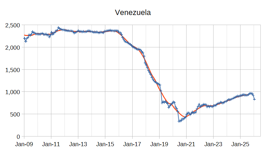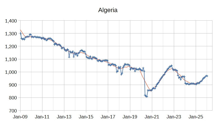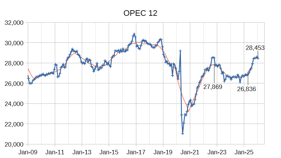 The OPEC Monthly Oil Market Report (MOMR) for December 2025 was published recently. The last month reported in most of the OPEC charts that follow is November 2025 and output reported for OPEC nations is crude oil output in thousands of barrels per day (kb/d). In the OPEC charts below the blue line with markers is monthly output and the thin red line is the centered twelve month average (CTMA) output.