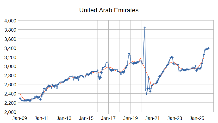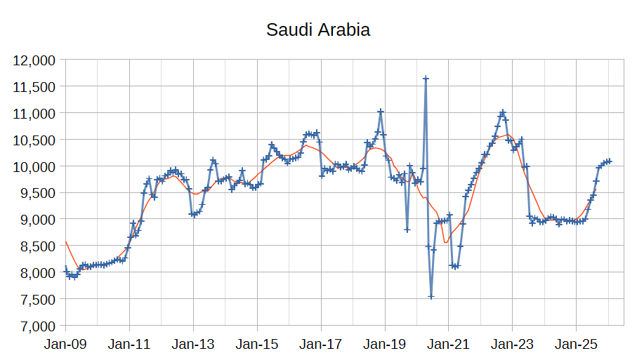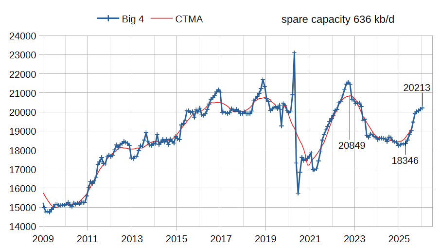 The chart above shows output from the Big 4 OPEC producers that are subject to output quotas and where most of OPEC spare capacity currently exists (Saudi Arabia, UAE, Iraq, and Kuwait.) After the pandemic, Big 4 average output peaked in 2022 at a centered 12 month average (CTMA) of 20849 kb/d, crude output has been cut by 636 kb/d relative to the 2022 CTMA peak to 202213 kb/d in January 2026. The Big 4 may have about 636 kb/d of spare capacity when World demand calls for an increase in output. Since April 2025 the OPEC Big 4 have increased output from 18346 kb/d to 20213 kb/d, an increase of 1867 kb/d in 9 months. The rate of increase in Big 4 output seems to be slowing lately. Note that there may be some added spare capacity from UAE, but there may have been reduced spare capacity in Kuwait and Iraq. My definition of spare capacity is the recent (past 48 months) 12 month peak of OPEC Big 4 output, claims of higher capacity remain unproven until we see sustained (12 month average) output at capacity.