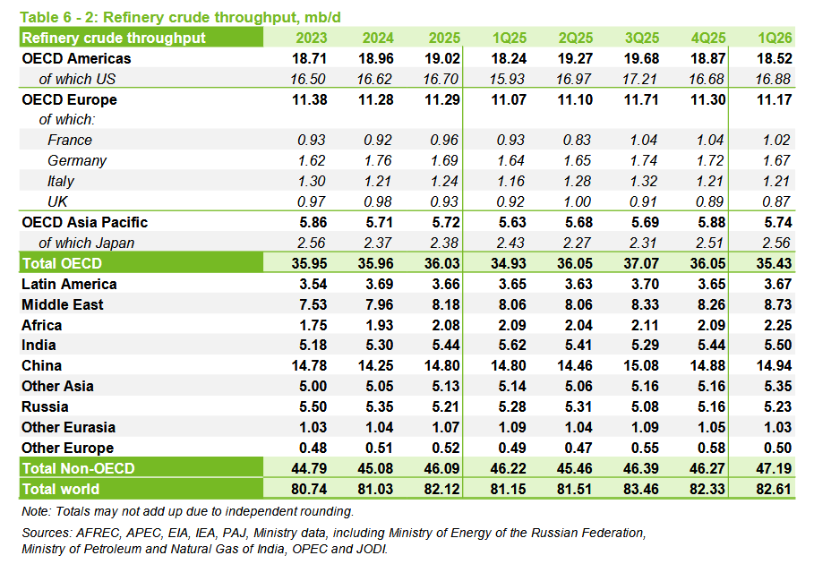 Refinery crude throughput is a measure of World demand for C+C (though imperfect because some crude is burned directly in power plants in the Middle East.) OPEC data shows the previous peak was 81.68 Mb/d in 2018. For the most recent 4 quarters (ending 2025Q1) the average World refinery throughput was 82.48 Mb/d, a new annual average peak which is higher than the 2025 average of 82.12 Mb/d by 360 kb/d and higher than the 2018 peak by 800 kb/d (roughly a 110 kb/d annual rate of increase over 7.25 years)