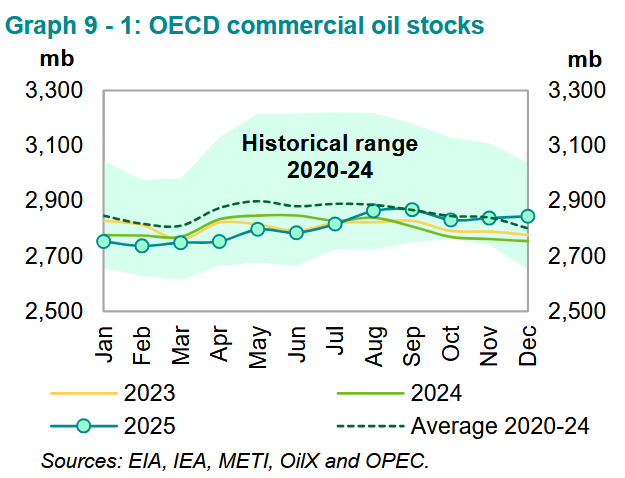 OECD commercial oil stocks rose above the 5 year average in December 2025 for the first tome in the past 36 months.