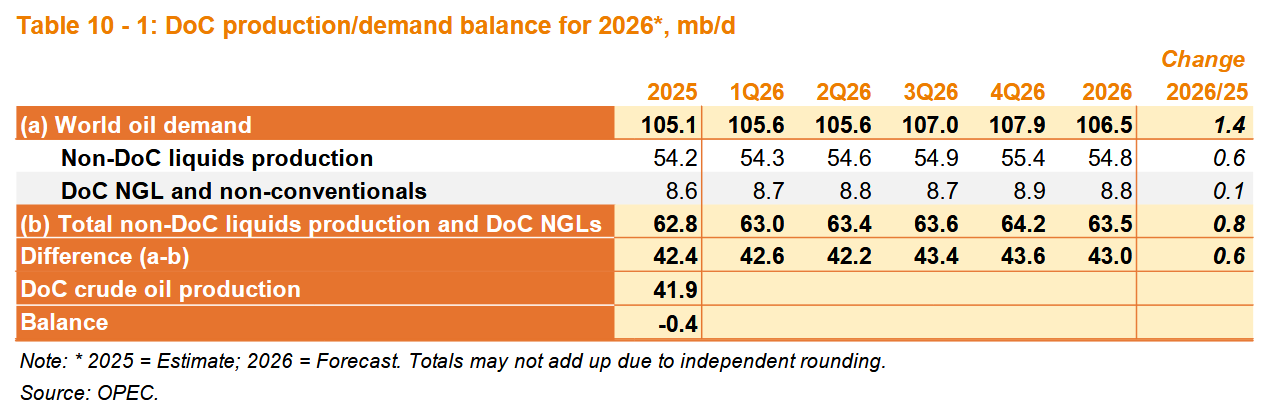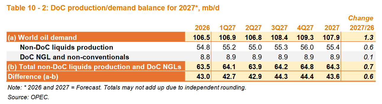 OPEC expects demand for petroleum liquids to rise by 1.4 Mb/d in 2026 and by 1.3 Mb/d in 2027 and expects demand for OPEC crude to rise by 600 kb/d in both 2026 and 2027. If the OPEC demand estimates and non-DOC liquids production estimates and my estimate for OPEC spare capacity are all correct we could see a very tight oil market in 2027. My guess is that demand will be less robust than the OPEC estimate.
