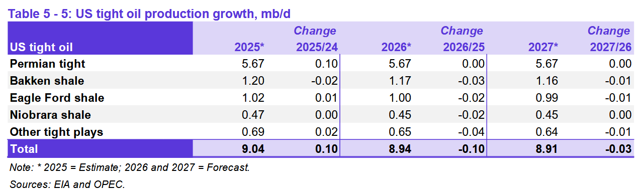 OPEC expects US tight oil output will fall in 2026 and 2027. This seems correct especially if oil prices follow the current futures market curve (with December 2027 WTI futures at $61.50/b as I write this.)