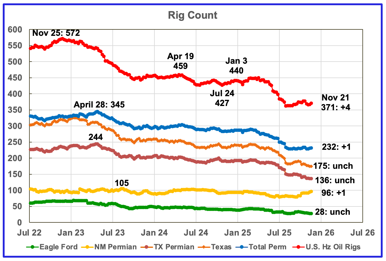 – US Hz oil rigs added 4 to 371, down 79 since April 2025 when it was 450. It is also up 9 from the low of 362 in the week ending August 1. The rig count is down 17% since April.