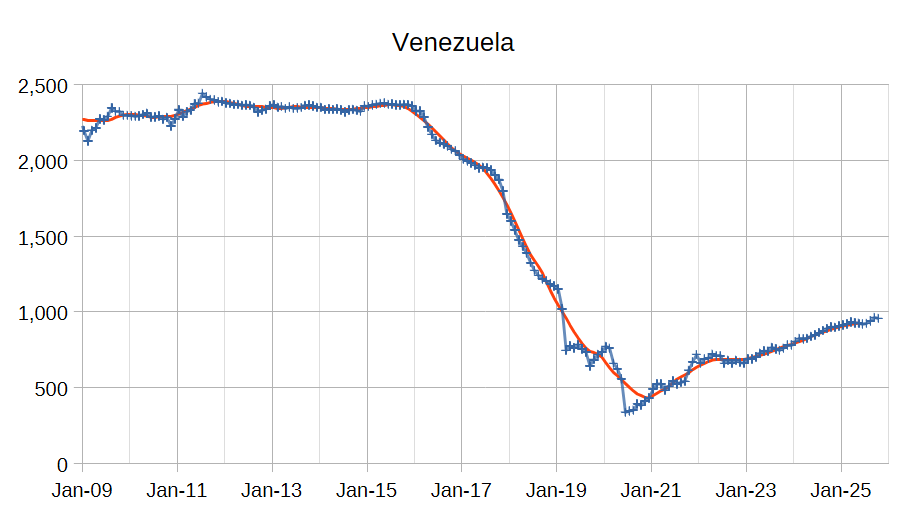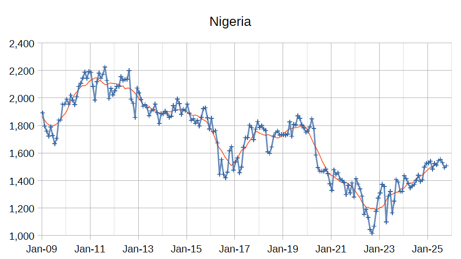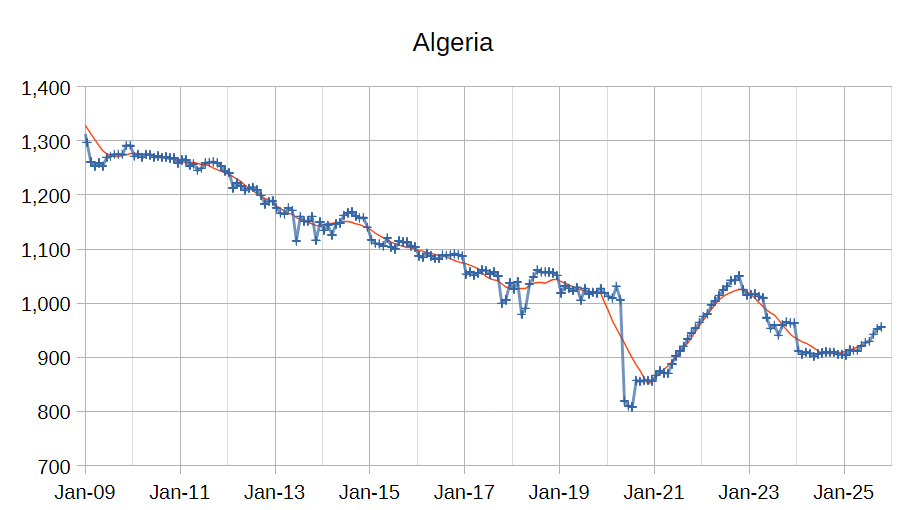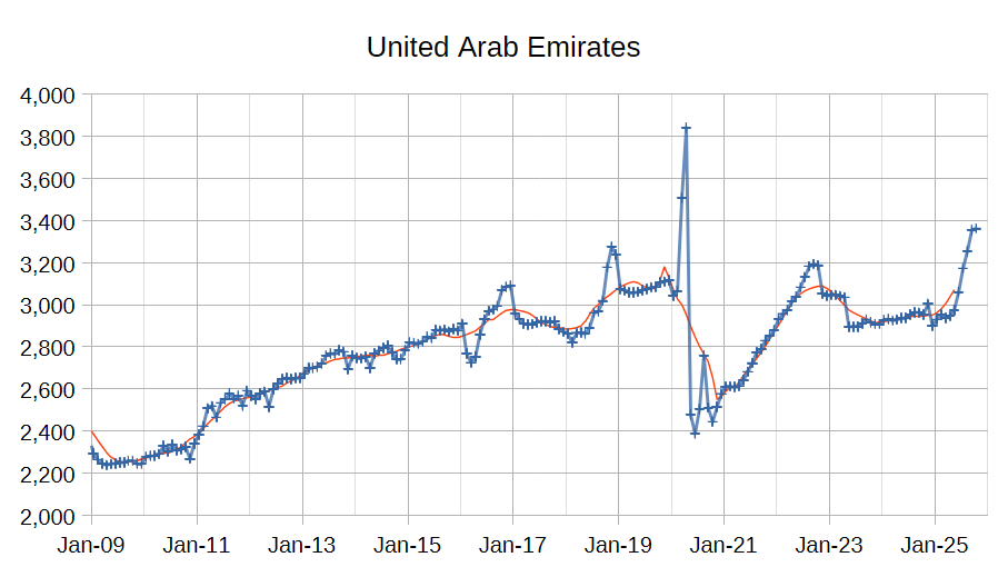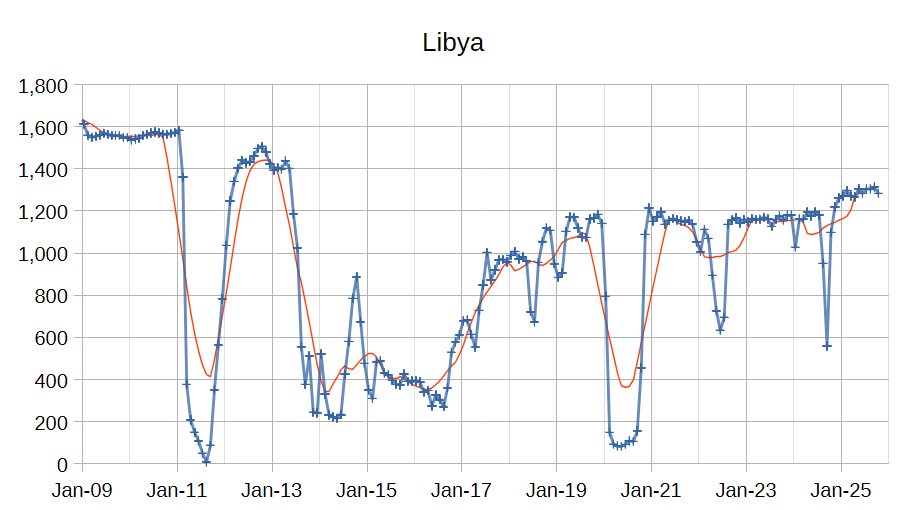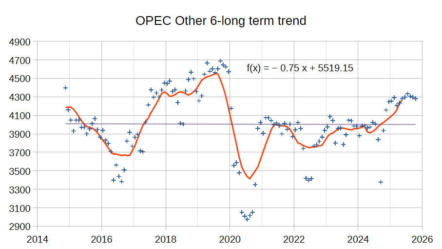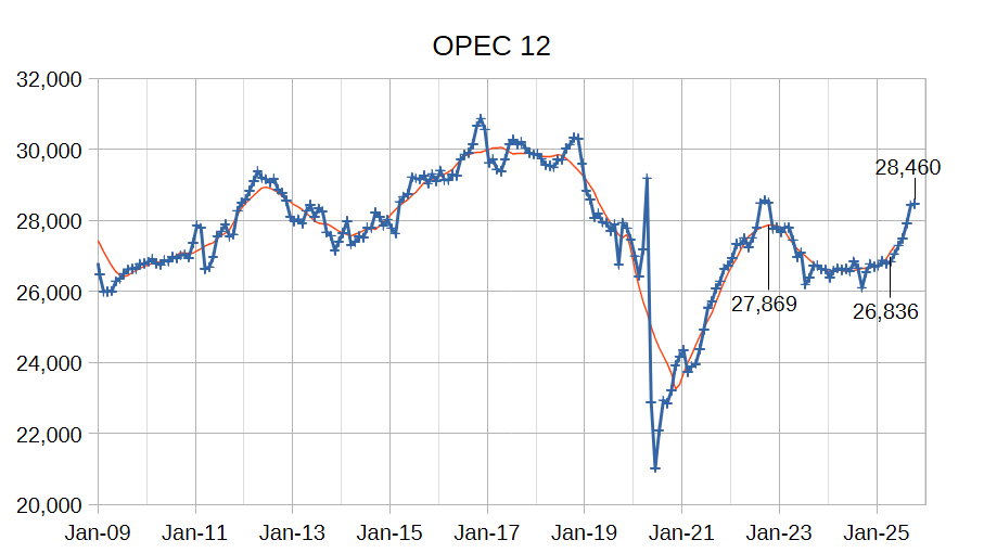 The OPEC Monthly Oil Market Report (MOMR) for November 2025 was published recently. The last month reported in most of the OPEC charts that follow is October 2025 and output reported for OPEC nations is crude oil output in thousands of barrels per day (kb/d). In the OPEC charts below the blue line with markers is monthly output and the thin red line is the centered twelve month average (CTMA) output.