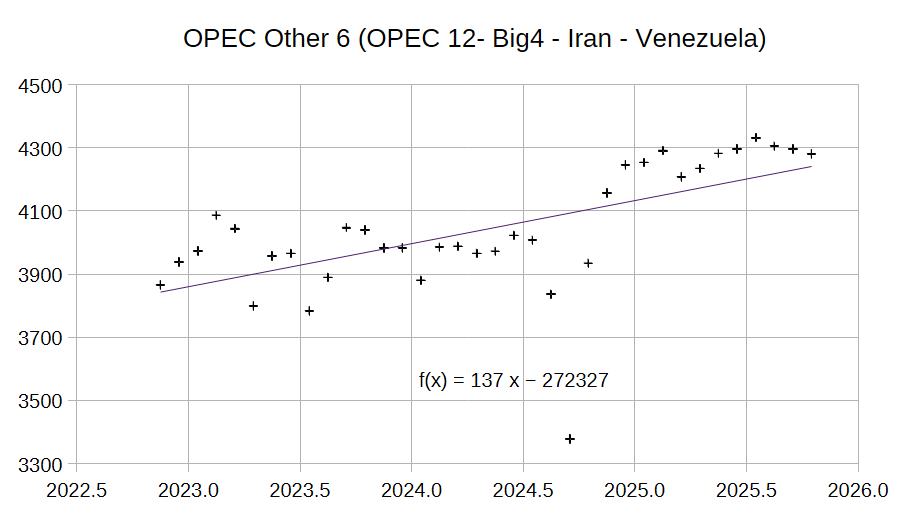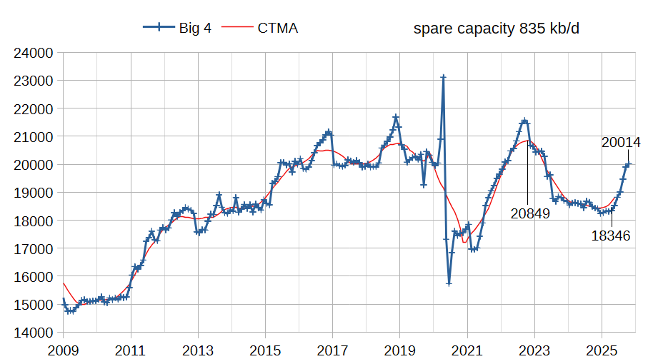The chart above shows output from the Big 4 OPEC producers that are subject to output quotas and where most of OPEC spare capacity currently exists (Saudi Arabia, UAE, Iraq, and Kuwait.) After the pandemic, Big 4 average output peaked in 2022 at a centered 12 month average (CTMA) of 20849 kb/d, crude output has been cut by 835 kb/d relative to the 2022 CTMA peak to 20014 kb/d in October 2025. The Big 4 may have about 835 kb/d of spare capacity when World demand calls for an increase in output. Since April 2025 the OPEC Big 4 have increased output from 18346 kb/d to 20014 kb/d, an increase of 1668 kb/d in just 6 months (an average monthly increase of 278 kb/d.) If the rate of increase of last month for the Big 4 (121 kb/d) continues in the future, OPEC spare capacity would run out in about 7 months. Perhaps this is part of the reason that future increases after December 2025 have been put on hold as spare capacity will be down to about 595 kb/d by the end of 2025 (assuming a 240 kb/d increase in output by the Big 4 over the next 2 months.)