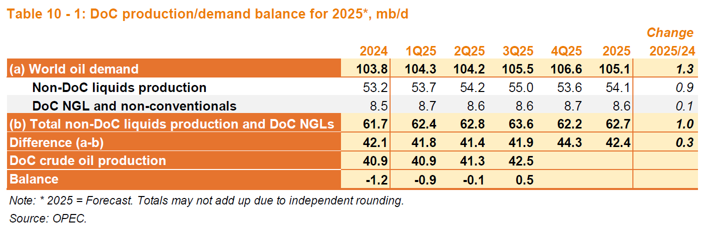 The only change in the production/demand balance from last month’s MOMR is a 100 kb/d increase in the forecast for Non-DOC liquids production in 2025, this reduces the increase in the call on OPEC by the same amount because the demand forecast is unchanged from last month’s report.
