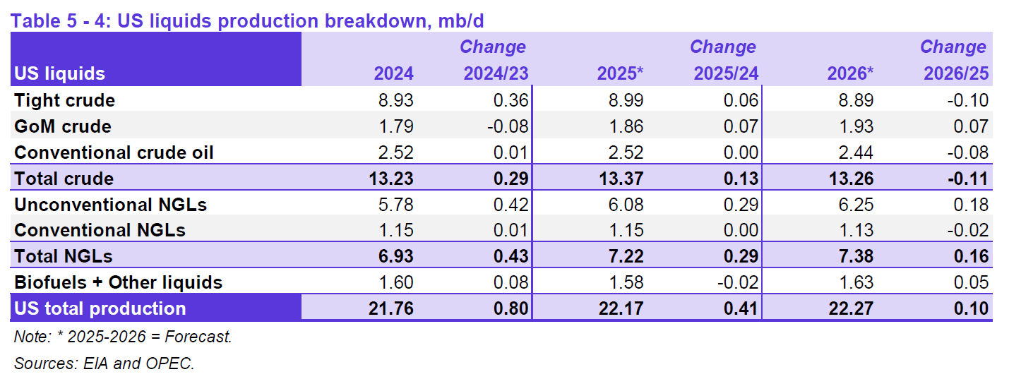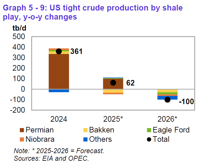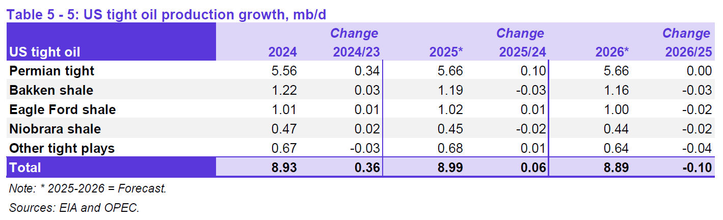 OPEC has reduced its estimate of US tight oil output in 2025 and 2026 compared to last month’s report by 10 kb/d for both years. Also the estimate for 2024 increased by 10 kb/d compared to last month’s report (in line with data from the EIA), so the increase in tight oil output from 2024 to 2025 is 20 kb/d lower than last month’s report while the decrease in tight oil forecast from 2025 to 2026 is unchanged from last month’s report.