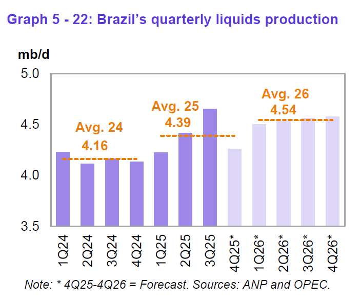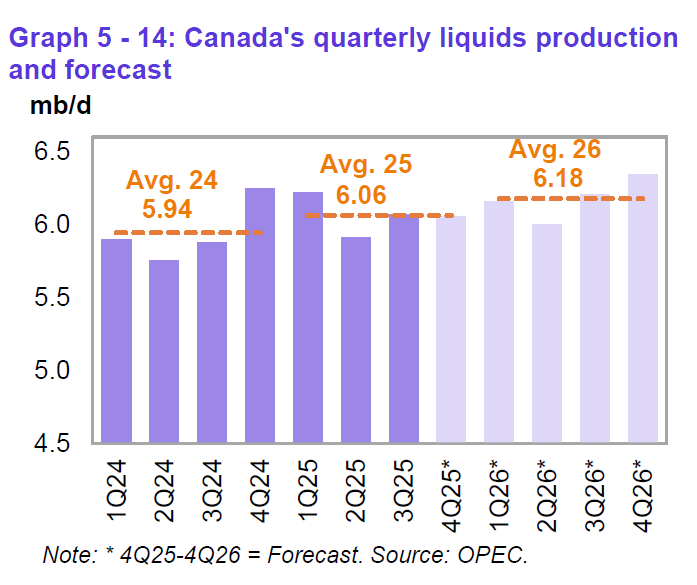 Above are two forecasts for output from non-OPEC+ nations from the November MOMR. OPEC forecasts Latin America non-OPEC output to increase by 300 kb/d in 2025 and by 500 kb/d in 2026. By deducting Brazil’s output and assuming the rest of the increase comes from Argentina and Guyana we get an increase of 70 kb/d in 2025 and 350 kb/d in 2026 for combined Argentina and Guyana output of liquids.