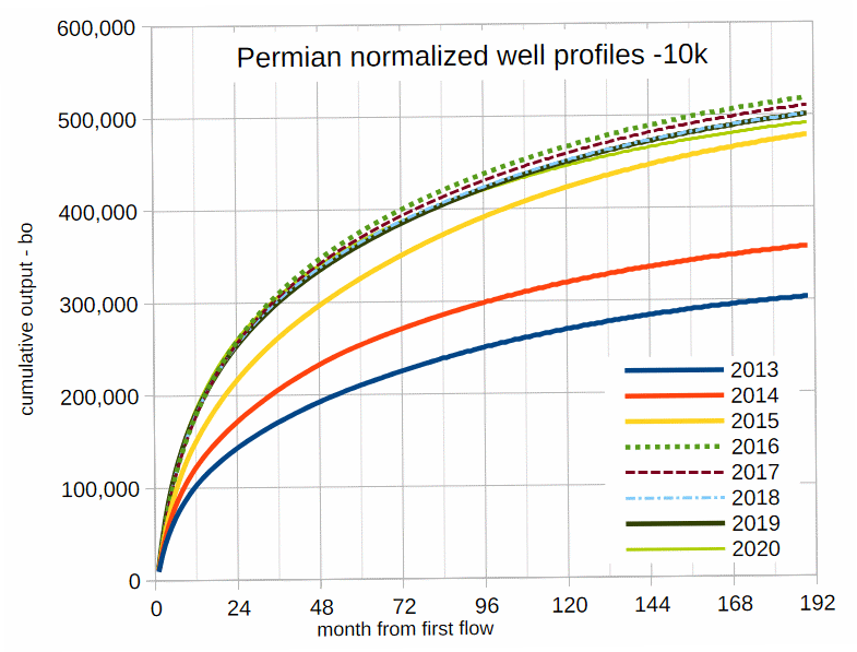I present average Permian well profiles normalized to a 10 thousand foot horizontal lateral length for wells with first flow from 2013 to 2020. Wells have the following EUR per 10 kft in cumulative barrels at 190 months for 2013 to 2020: