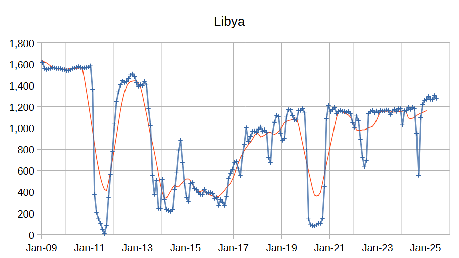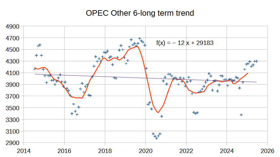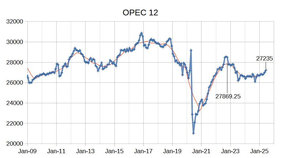 The OPEC Monthly Oil Market Report (MOMR) for July 2025 was published recently. The last month reported in most of the OPEC charts that follow is June 2025 and output reported for OPEC nations is crude oil output in thousands of barrels per day (kb/d). In the OPEC charts below the blue line with markers is monthly output and the thin red line is the centered twelve month average (CTMA) output.