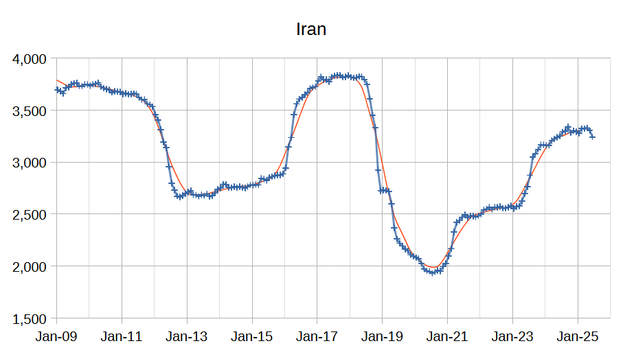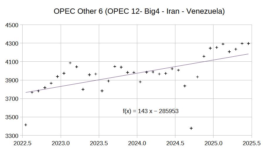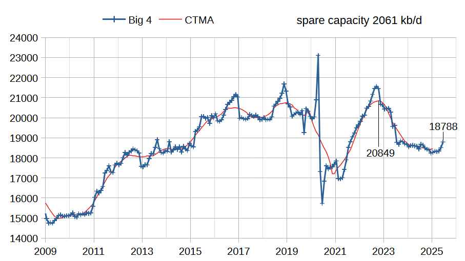 The chart above shows output from the Big 4 OPEC producers that are subject to output quotas (Saudi Arabia, UAE, Iraq, and Kuwait.) After the pandemic, Big 4 average output peaked in 2022 at a centered 12 month average (CTMA) of 20849 kb/d, crude output has been cut by 2061 kb/d relative to the 2022 CTMA peak to 18788 kb/d in June 2025. The Big 4 may have about 2061 kb/d of spare capacity when World demand calls for an increase in output. Note that peak capacity might be as much as 2200 kb/d higher for a single month, but the important number is output that can be sustained for at least 12 months. My estimate is based on output that have been proven over 12 months rather than capacity that is claimed.