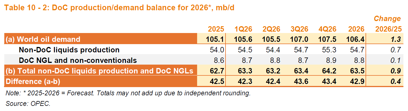 The OPEC forecast for annual change in US tight oil output has been revised from last month’s MOMR with 2024 lower by 2 kb/d, but the forecast change in US tight oil output in 2025 and 2026 remain thae same as last month’s forecast.