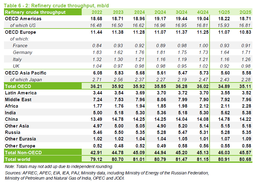 Refinery crude throughput is a better way to determine World demand for C+C (though imperfect because some crude is burned directly in power plants in the middle east.) OPEC data shows the peak was 81.68 Mb/d in 2018. For the most recent 4 quarters the average refinery throughput was 81.05 Mb/d, the previous 4 quarters had average refinery throughput at 81.08 kb/d and 2024 had refinery throughput at 81.01 kb/d, so only about a 40 kb/d increase in the annual average over 6 months which suggests another 8 years to return to the 2018 peak if the recent rate of increase (over past 6 months) in refinery throughput continues for the next 8 years.