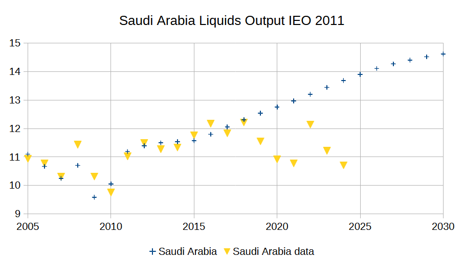 In the International Energy Outlook from 2004 (from when Simmons was writing his book) the EIA only project oil production capacity for Saudi Arabia (probably total liquids it is not very clear).