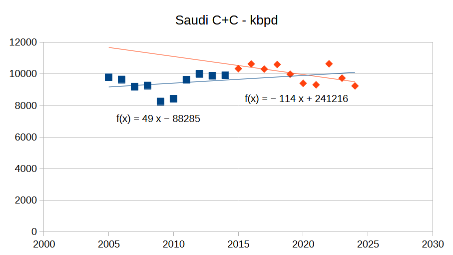 2. I mean…sure we can’t prove that the Saudis can do 12+ in a Eucidean fashion unless we see it. (Nor can we prove the converse either, of course!) But from a logical fashion, looking back at c. 2005, if the Saudis did 20 years from 2005-2024 at ~9.5 bopd (and they did), why is it so hard to believe they couldn’t have done 12 during that time, for a year or two? I mean the oil was in the rocks. Sure, it drains the reservoir faster. And sure you gotta drill more wells and expand the pipelines. But it is not an “area under the curve” constraint. I would think a peak oiler would understand that especially well.