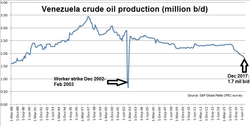 Other than that, oil production is the lowest in 28 years. It’s down 27% just since 2014, when the country’s economic crisis took hold, according to OPEC and S&P figures.