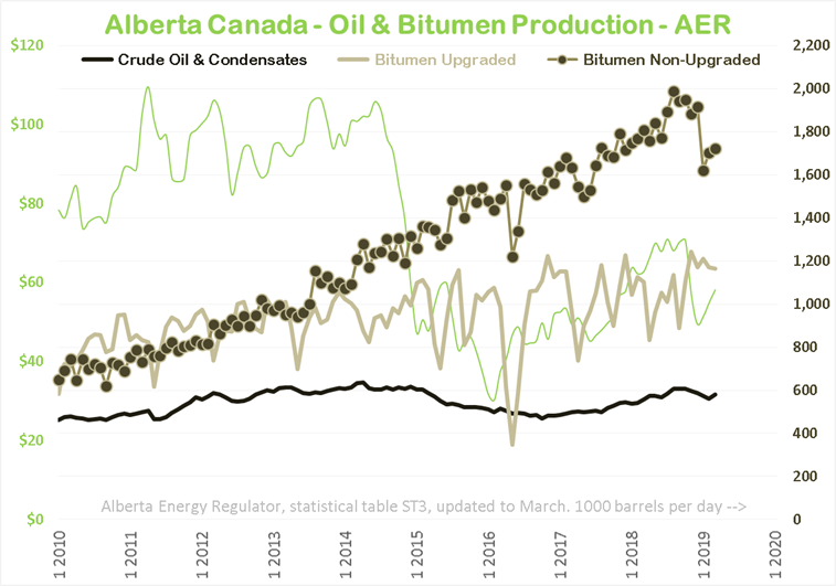 Alberta (AER) March crude oil and condensate and bitumen production (without LPG) is 3,468 kb/day up +33 from February