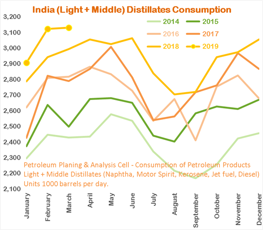 India (PPAC) Consumption of (Light + Middle) Distillates (1000 b/day)