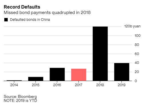 2019-06-08 (Bloomberg) China bond defaults so far this year total $5.8 billion, 3.4 times the total for the same period in 2018