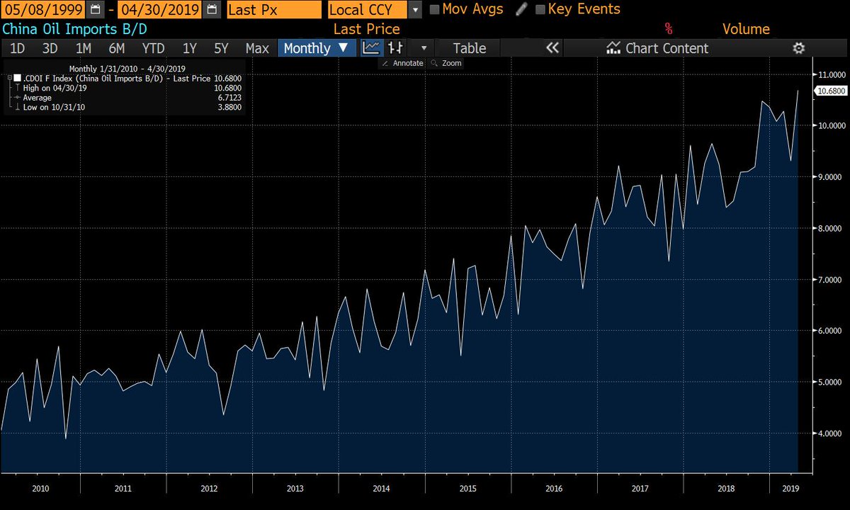 2019-06-08 (Bloomberg) China’s crude imports climbed to a record last month as it stocked up on Iranian oil before exemptions from U.S. sanctions expired. +10.8% y/y