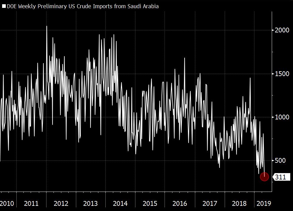 US crude oil imports from Saudi Arabia were down to a new multi-year low of 311 kb/day last week